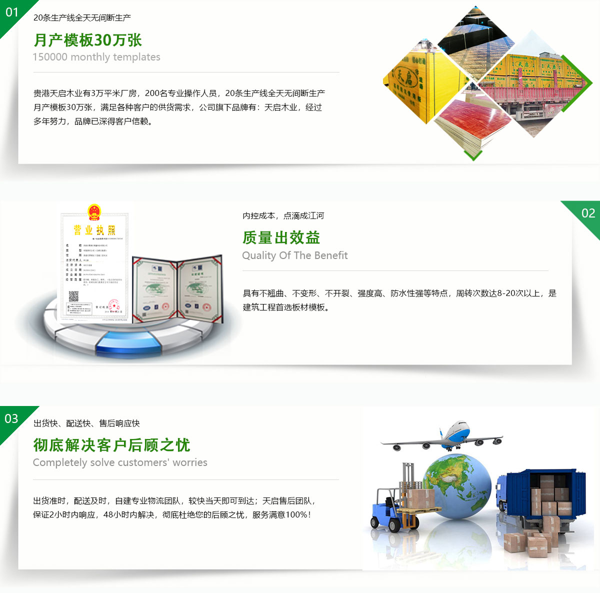 貴港市天啟木業(yè)位廣西貴港市覃塘區(qū),是中國建筑模行業(yè)規(guī)模十大的企業(yè)之一,有著優(yōu)越地理位置,臨廣東,貴州,湖南,云南、交通運(yùn)輸區(qū)位十分優(yōu)勢(shì)。現(xiàn)有職工近300人,占地50余畝,其中建筑面積近3萬平方米。日產(chǎn)量2萬張,年產(chǎn)量500萬余張;公司正在逐步壯大,旗下有4家分公司,總年產(chǎn)量近1500萬張!天啟木業(yè)引進(jìn)芬蘭制膠技術(shù),采用先進(jìn)生產(chǎn)工藝。公司生產(chǎn)的建筑膜板采用優(yōu)質(zhì)的防水膠制作,循環(huán)使用次數(shù)多,品質(zhì)在同行業(yè)內(nèi)認(rèn)可度極高。是一家集產(chǎn)品研發(fā),生產(chǎn),銷售,服務(wù)于一體的綜合型大型民營企業(yè)。產(chǎn)品覆蓋全國20多個(gè)省,市,自治區(qū)。
